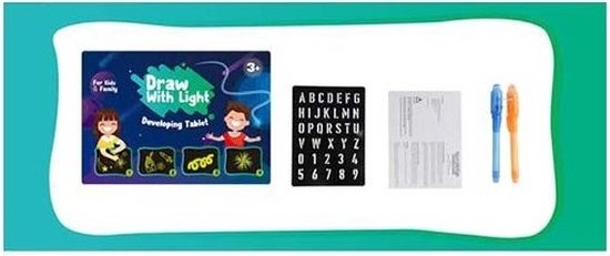 Met de bijgeleverde magische Glow In The Dark tekenpen kan het kind de mooiste magische tekenen maken. Deze zijn namelijk alleen in het donker te zien en vervagen weer na ongeveer 30 minuten. Dit heeft te maken met de hoeveelheid licht die aanwezig is in de kamer. Hoe donkerder de kamer, hoe helderder de tekening! De set wordt geleverd met sjablonen van letters en cijfers, een magische pen en de handleiding.