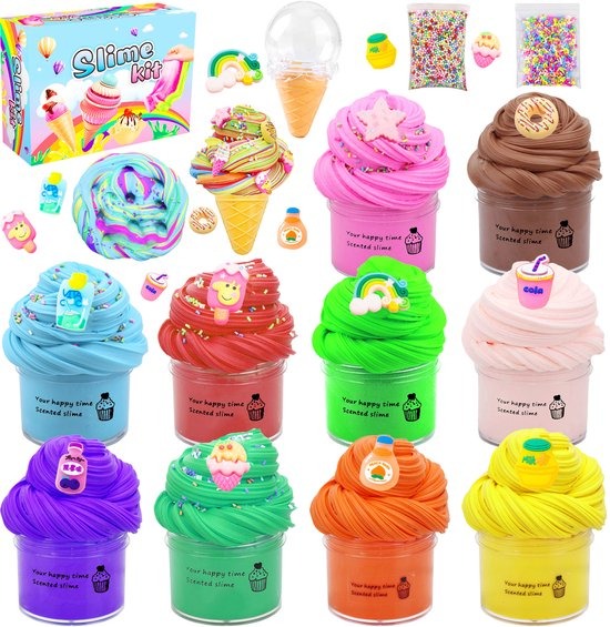 In deze set zitten 10 verschillende soorten slijm. Daarnaast zitten er ook verschillende accessoires in de set om de slijmcreaties mee te versieren.
