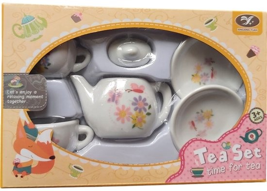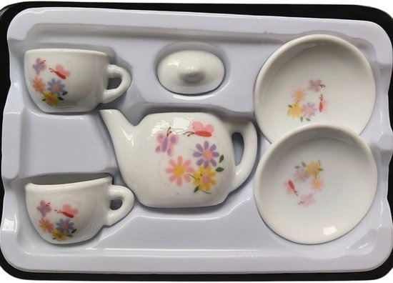 Leuke speel theeset met fraai bloemenpatroon 6 delig bestaande uit: -2 kopjes -2 schotels - theepotje - theepot deksel verpakkings afmetingen 17,5 x 11,5 x 3,3 cm