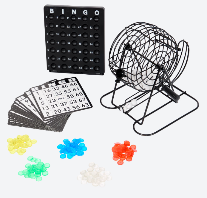 • Bingo-spel met 75 bingoballen, 150 gekleurde muntjes en 18 herbruikbare bingokaarten