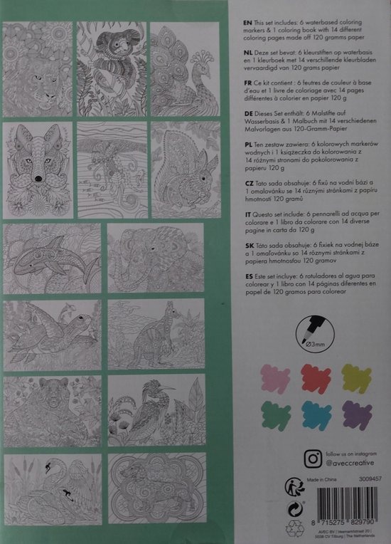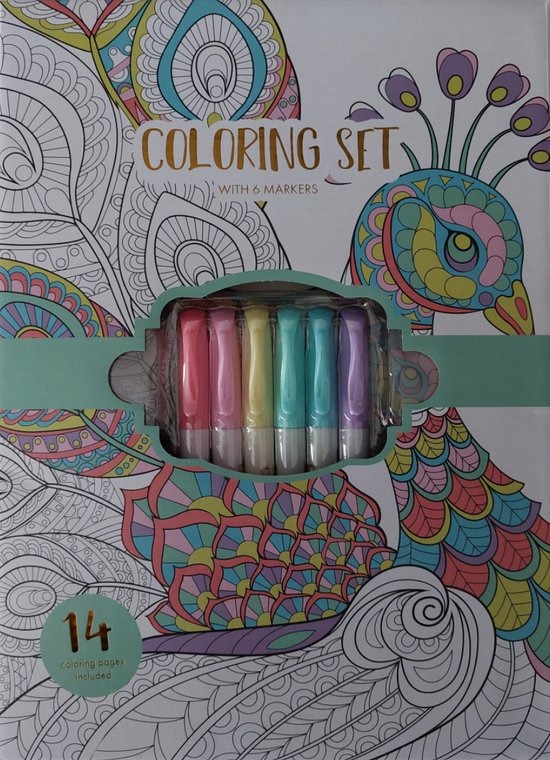 Deze set bevat 6 kleurstiften op waterbasis en 1 kleurboek met 14 verschillende kleurbladen.